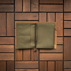 A Japanese journaling system for refillable leather journals which uses elastic bands to add notebook inserts, pocket folders and other journaling accessories.