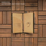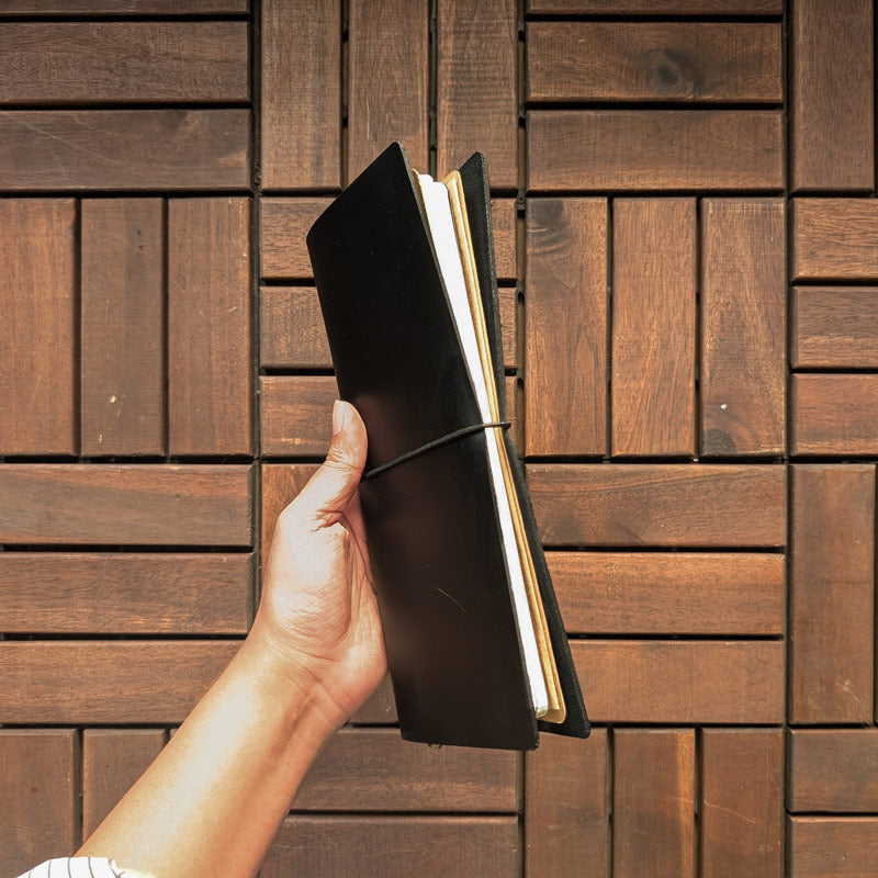 A Japanese journaling system for refillable leather journals which uses elastic bands to add notebook inserts, pocket folders and other journaling accessories.