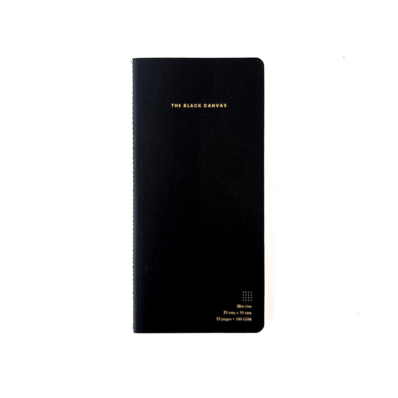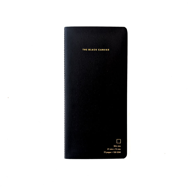 Black TBC Notebooks - Slim are the latest addition to our range of meticulously crafted notebooks. The slim-sized notebooks feature 72 pages of 100 GSM white eco-friendly paper, and rounded corners. The cover is crafted in black paper with black stitching on the spine and details debossed in gold foil.
